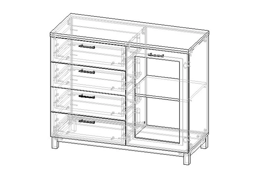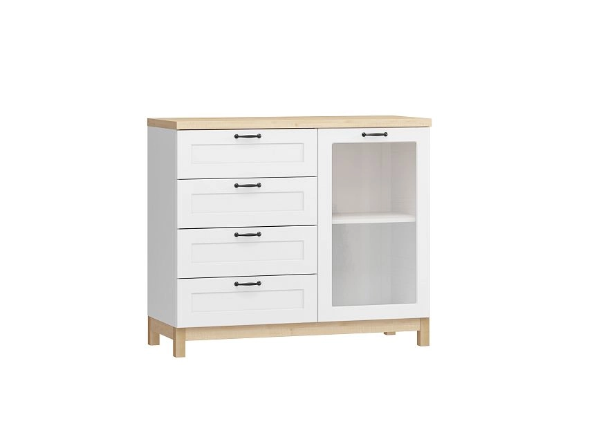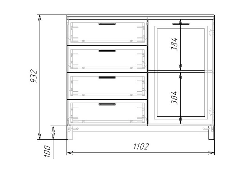 Комплектация: направляющие шариковые 100% выдвижения, фасады с фрезеровкой, петли без доводчика, ножки массив дерева, стекло простое