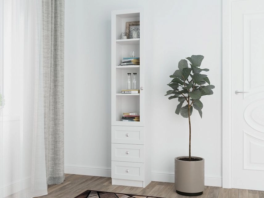 Комплектация: фасады - рамка МДФ квадро + вставка ЛДСП/стекло простое, задняя стенка ЛДВП белого цвета, ручка кнопка КН-1 хром, петли без доводчика, роликовые направляющие